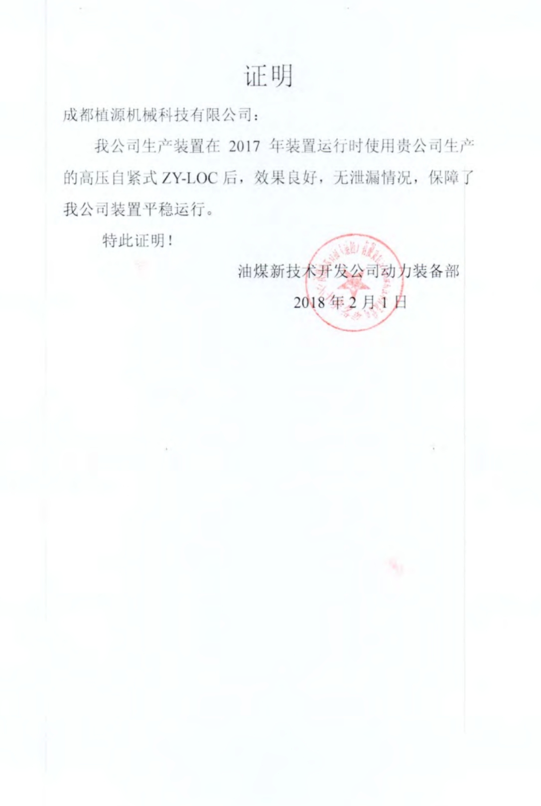 油煤新技術(shù)開(kāi)發(fā)公司使用證明